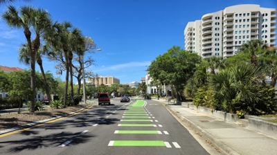 The Streets and Stormwater department has started installing 20-foot green thermoplastic bike lane panels at key intersections. These markings help with awareness and visibility while identifying potential conflict areas. You can see them at Gulf Shore Blvd N and Park Shore Drive, among other locations.